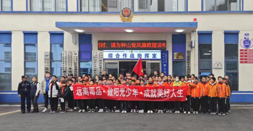 近日,六盘水强制隔离戒毒所(以下简称六盘水所)驻钟山区黄土坡街道“专地融合”工作站联合钟山区禁毒办、钟山区黄土坡街道、钟山小学组织钟山小学部分学生在黄土坡街道禁毒教育基地开展以“远离毒品·做阳光少年·成就美好人生”为主题的禁毒宣传活动。