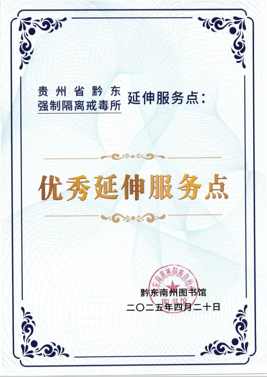 黔东南州图书馆授予省黔东所“优秀延伸服务点”证书,推进教育矫治工作与社会资源融合,拓宽了戒毒人员接触优质文化资源的渠道,帮助戒毒人员通过阅读重建价值观。