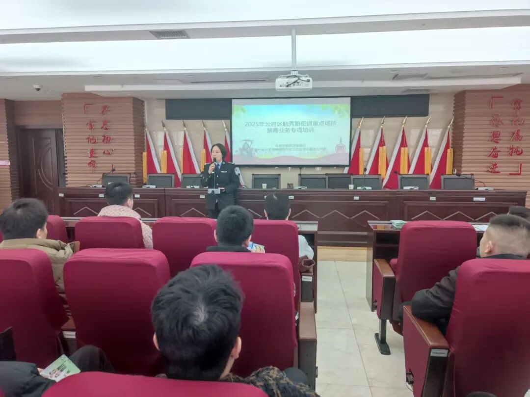 近日,贵州省女子强制隔离戒毒所驻云岩区“专地融合”工作组联合云岩区毓秀路街道,在国贸置业大厦组织开展重点场所禁毒专题培训。辖区内娱乐场所、酒店、洗浴中心、网吧及物流寄递行业的管理与从业人员近百人参训。