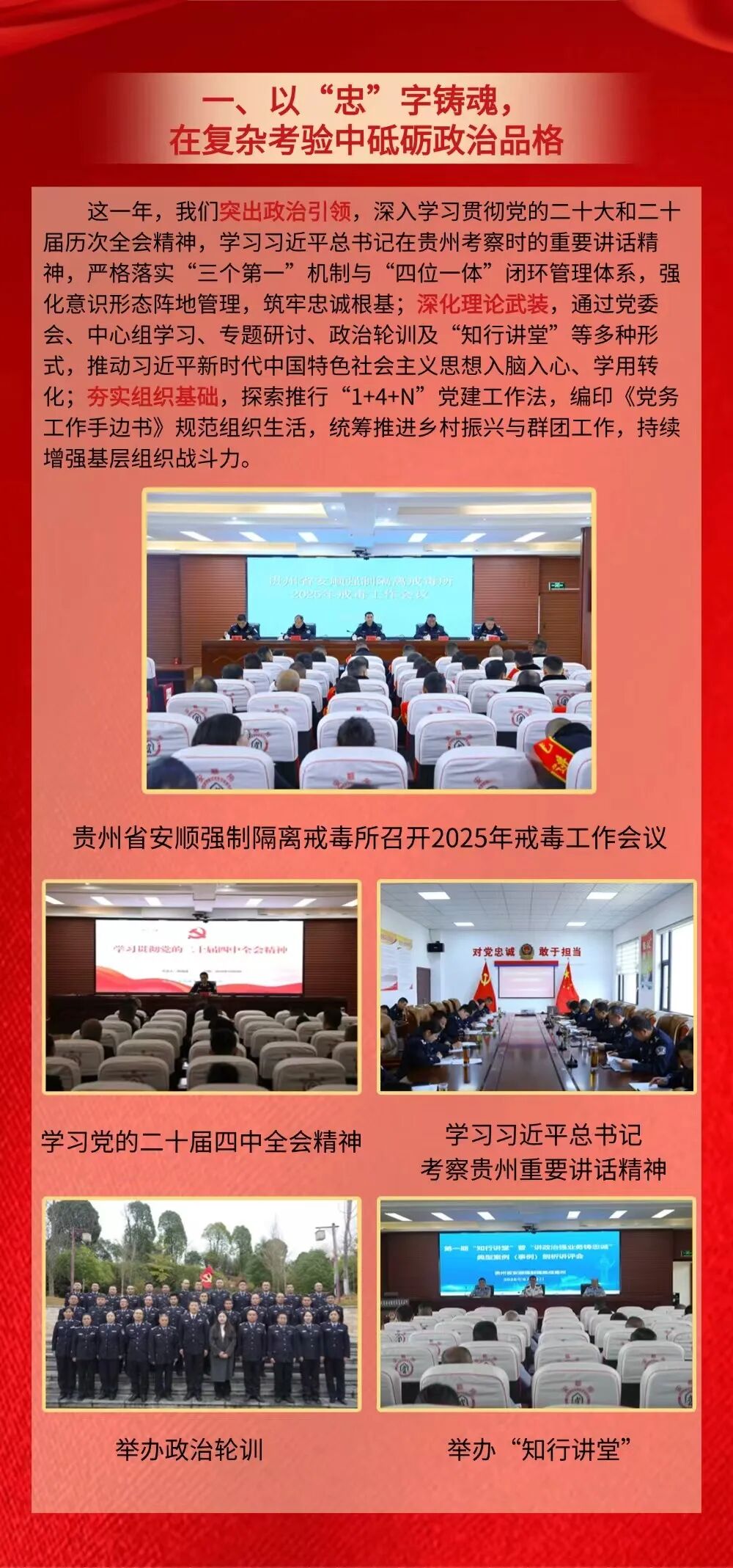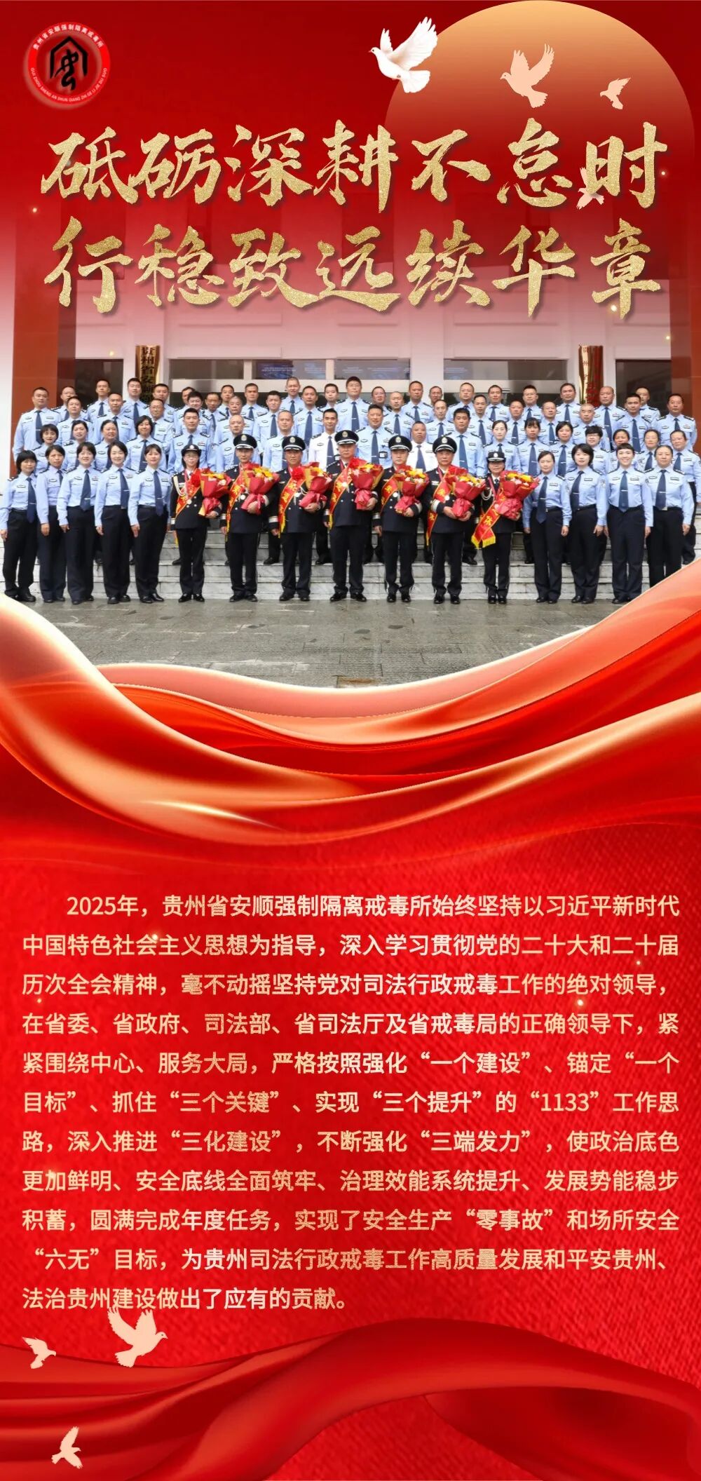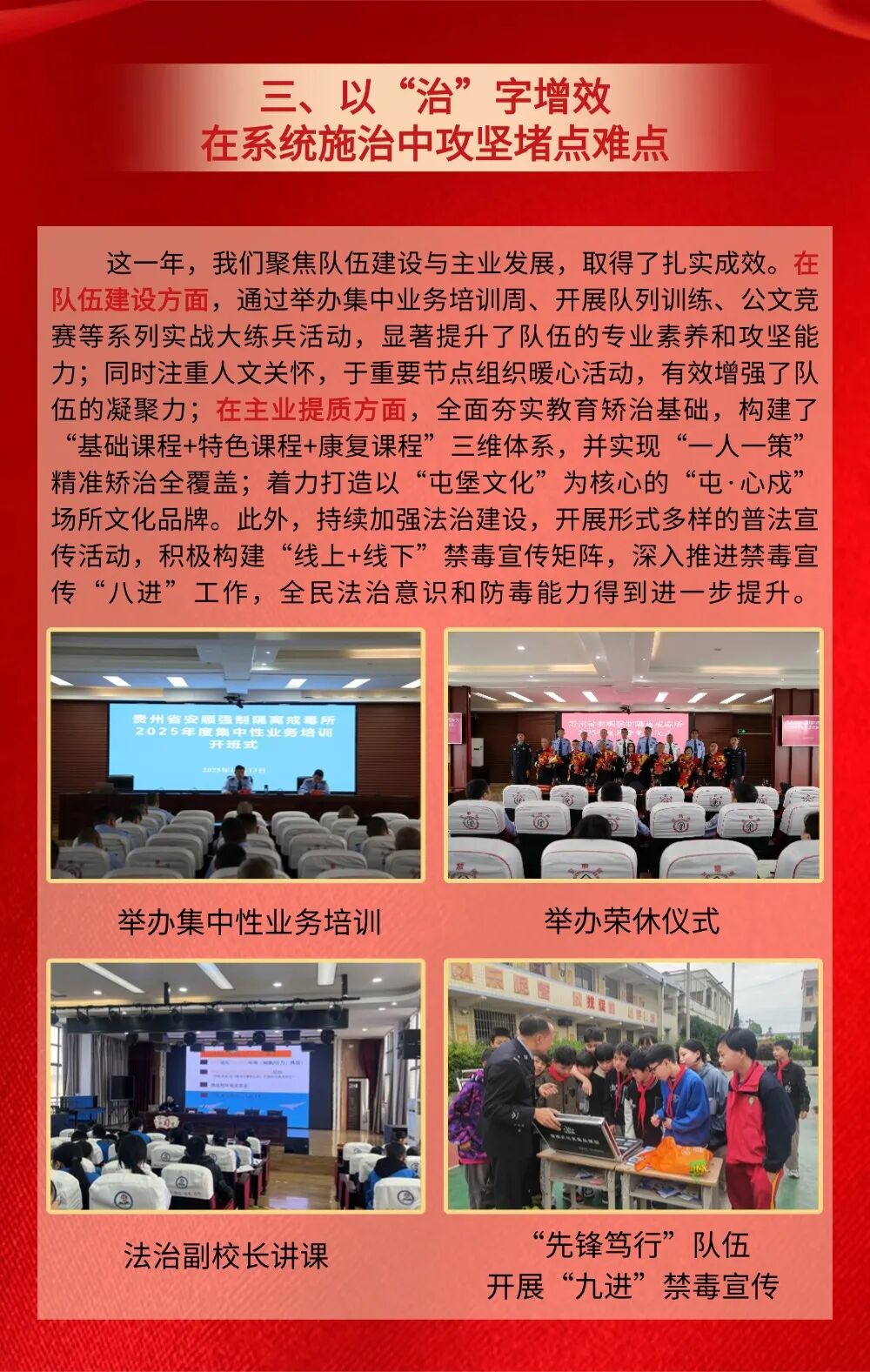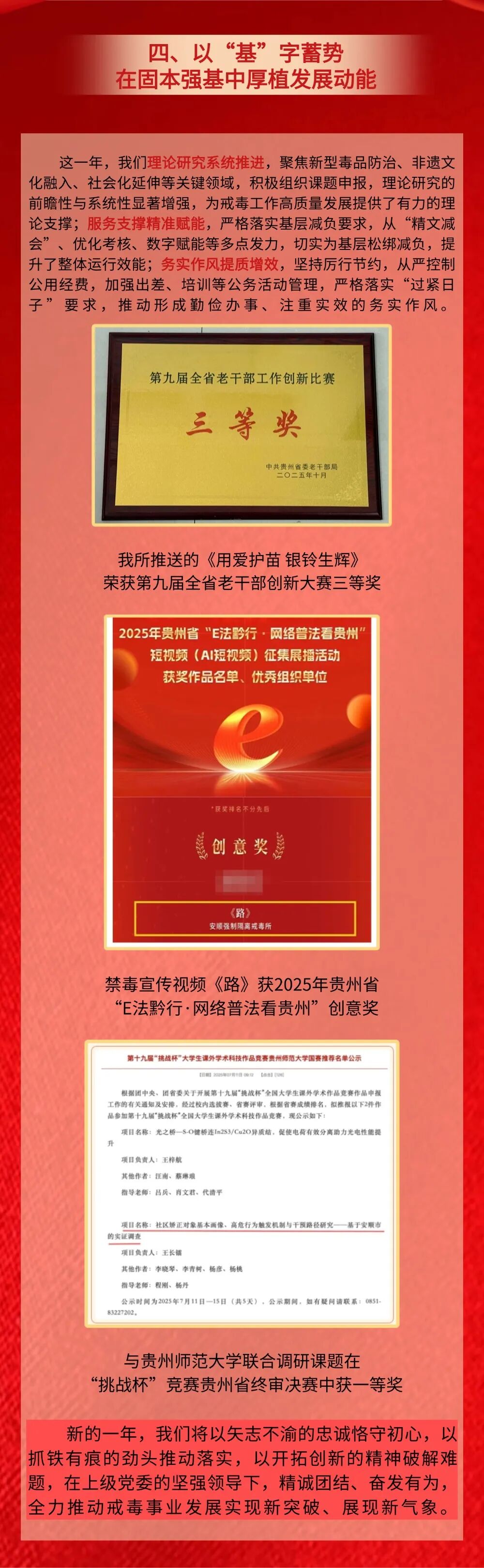 2025年,在省委、省政府、司法部和省司法厅党委的正确领导下,全省司法行政戒毒系统始终坚持党对政法工作的绝对领导,认真贯彻落实习近平总书记在贵州考察时的重要讲话精神和对贵州工作重要指示精神,坚持以维护国家政治安全和社会大局稳定为中心任务,主动适应服务经济发展新常态和禁毒斗争形势新变化,全面贯彻落实“一体两翼”战略布局,以推进标准化、规范化、法治化“三化建设”强化基层基础,在毒品问题综合治理前端、中端、末端“三端发力”充分履行职责,全力以赴防风险、保安全、护稳定,凝心聚力拓职能、优戒治、促发展,加快推进全省司法行政戒毒工作高质量发展,为夺取禁毒人民战争新胜利,推动全省毒品治理体系和治理能力现代化贡献了应有力量。